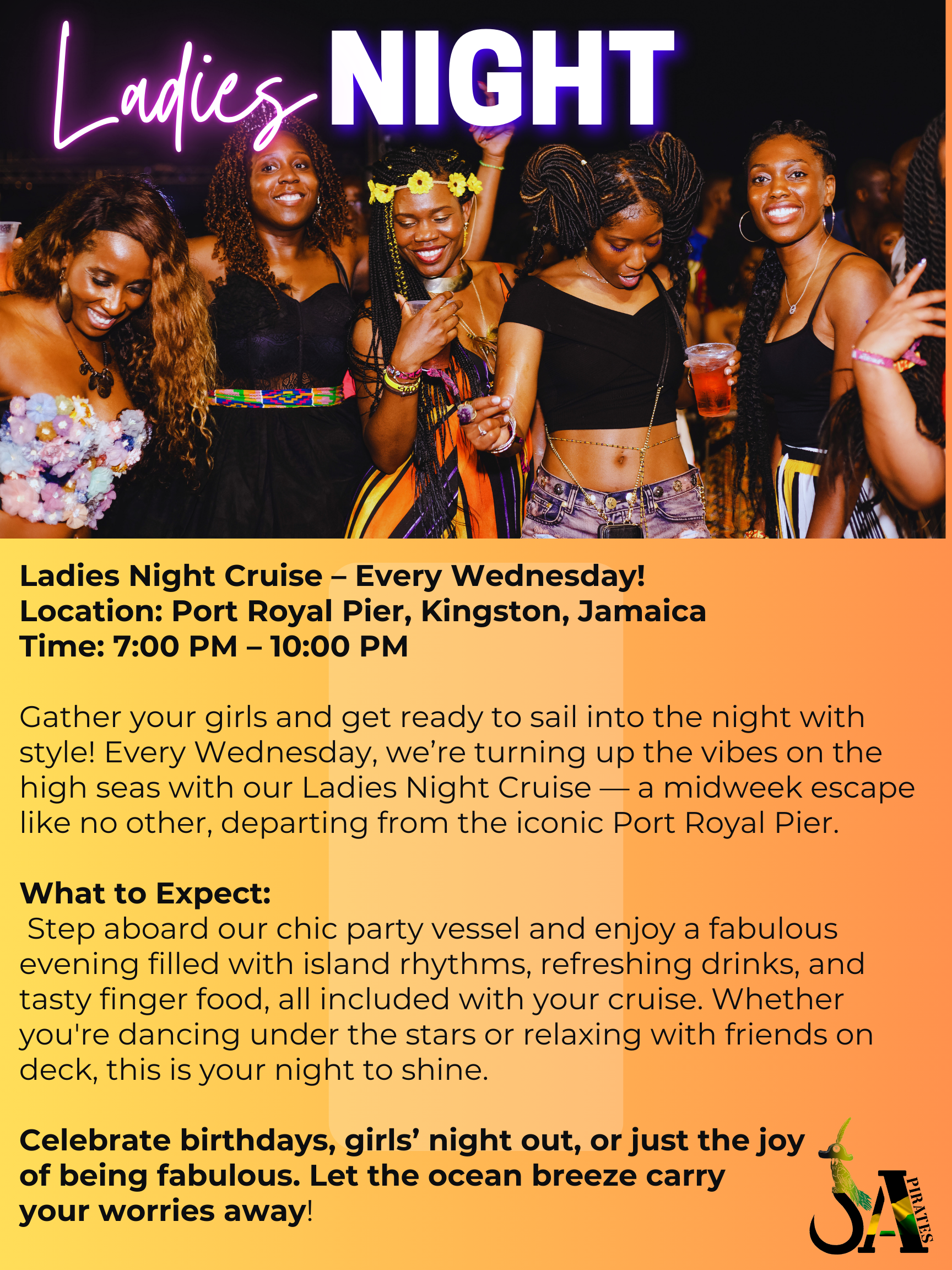 Ladies Night Cruise Location: Port Royal Pier, Kingston, Jamaica Wednesdays Time: 7:00 PM – 10:00 PM Cruise includes: light snacks & open Jamaican bar